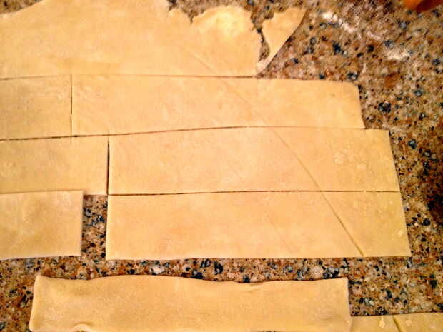 1. Estirar la masa hasta 1/8 de pulgada de grosor.  No importa la forma que se extienda en como estará cortando círculos y bandas a los tarros con la línea.