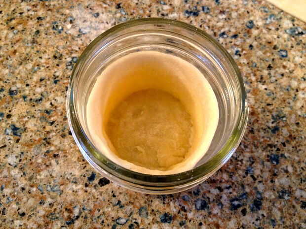 4. Presione el círculo de masa en la parte inferior y la tira a lo largo de los laterales para formar el interior de la corteza para la jarra.  En este punto ahora puede cargar su relleno de elección en la jarra.  Deje espacio en la parte superior de la tarta a modo que la tapa puede caber en una vez que se cuece al horno.