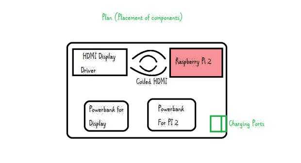 La foto de arriba muestra el funcionamiento de la computadora portátil de Pi-Berry. En la etapa temprana de diseño hice recortes de componentes individuales en un documento gráfico para averiguar cómo debe ser colocados dentro del cuerpo (chasis) de la computadora portátil. Aquí es el mejor diseño posible que surgió. Los componentes están colocados estratégicamente para permitir el consumo de espacio mínimo.