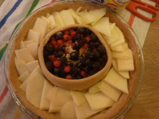 La obra del centro; echar un puñado de grosellas rojas y grosellas negras (puede utilizar y realmente la fruta, pero el contraste se ve genial) y espolvorear con azúcar de demerara, debido a que la fruta puede ser muy amarga, ser generoso!