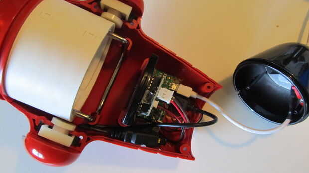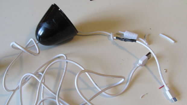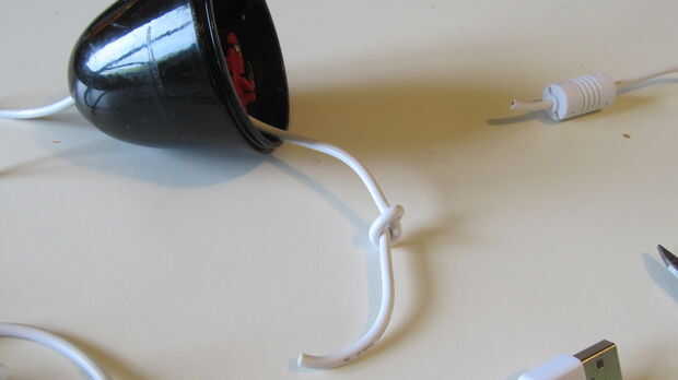 Corte de un cable usb largo y pase por el orificio de la cola de la lámpara. Hacer un nodo en el cable de alivio de cable.