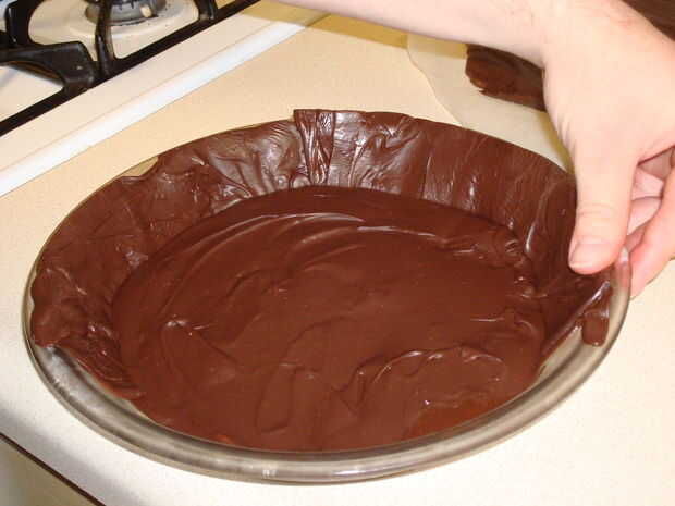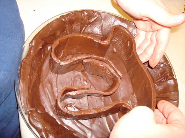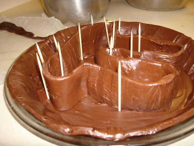 Cortar el dulce de azúcar se separan hacia fuera en tiras aproximadamente tan anchos como la altura de los costados de la tartera. Poner las tiras alrededor del borde de la tarta. Puede utilizar el dedo para derretir los lados en la parte inferior. Utilizar el resto de las tiras para un pi en forma de bien en medio de la tarta del molde. Manipula similar a suave de la arcilla o plastilina. Puede utilizar palillos de dientes para el fudge permanezca para arriba.
