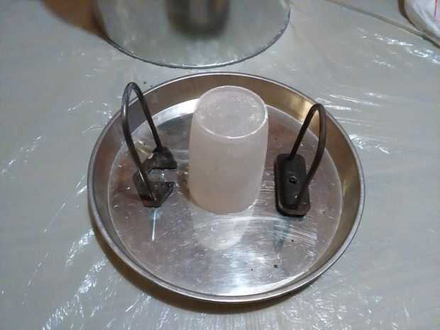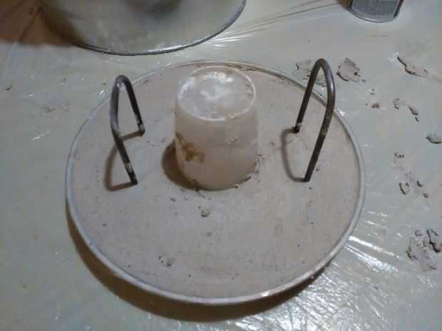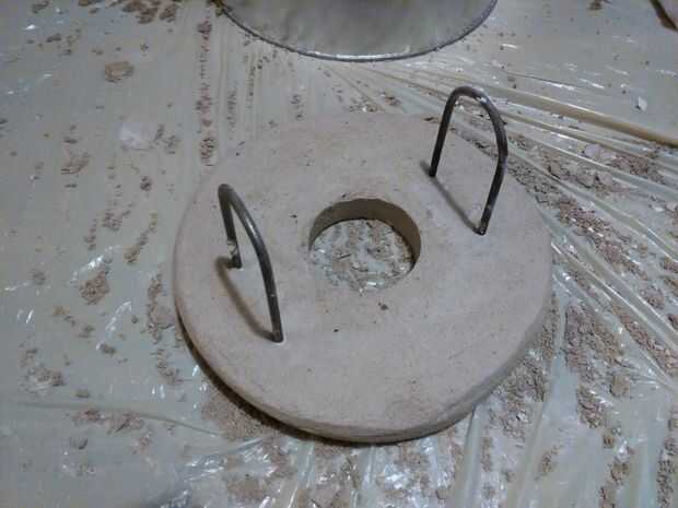 Es importante hacer una tapa, que se puede colocar en el horno, ya que retiene el calor y nos permite fundir el aluminio mucho más rápidamente. Para hacer una simple tapa, vierta la misma mezcla refractaria de arena yeso en una bandeja redonda y coloque un plástico de la taza en el centro y colocar dos pernos en u en la mezcla. Thease van a función como manijas.