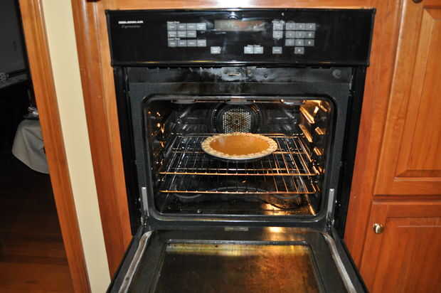 Hornee a 450 por 15 minutos antes de la reducción de hasta 350 y continuar la cocción durante 50 minutos. Para evitar que la corteza se quema, puede decidir utilizar un escudo de corteza de pastel o papel de aluminio para cubrir la corteza durante los últimos 30 minutos de cocción. Esto es opcional y no es siempre un problema. Si utilizas papel de aluminio, puede averiguar su papel antes de rellenar la tarta y poner en el horno para evitar quemaduras. Lo siento si esto llegó demasiado tarde.