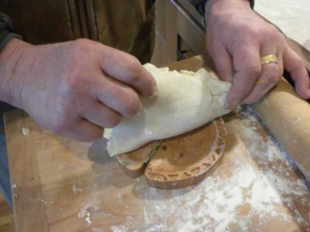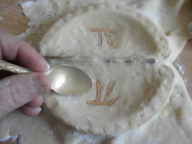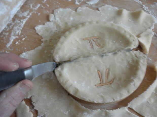 me di cuenta finalmente que la masa es pegajosa, al contador, para el perno de balanceo, para mí, todo. Entonces, eureka, me acordé de la abuela siempre arrojó harina sobre el contador y el pin y entonces comenzó a rodar. Debemos recordar, que podrían haber tenido una razón. Bien, funcionó realmente bien. Después de rodar la masa hacia fuera a un grande bastante tamaño y espesor, volteado en la parte superior del molde y empuja la masa hacia abajo con los dedos, utiliza una cuchara para encontrar el símbolo pi y cortar alrededor de ella con un cuchillo para exponer la imagen. Entonces apliqué el secreto, una curita, es decir. otro pedazo de masa en el interior.