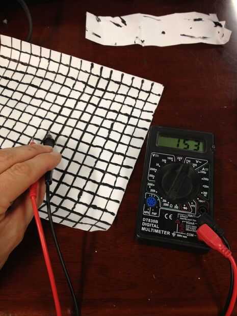 Mientras que un conjunto de medidas produjeron un valor de pi como impresionante (para mí) como 3,38, en general observé pobre consistencia de las mediciones entre casillas adyacentes cerca del centro de la página y pobre repetibilidad de mediciones para las plazas probadas. Sin embargo, espero que usted, estimado lector, considerará intenta este experimento por sí mismo. Te diré cómo lo hice, y tal vez tendrá más cuidado que al aplicar la pintura con exactitud y precisión; de lo contrario, también observará una alta variación de la resistencia entre sus resistencias. Tenga en cuenta también que la resistencia de la pintura pelada disminuye a medida que se seca, así que asegúrese de permitir suficiente tiempo para el secado (decenas de minutos) antes de las mediciones.