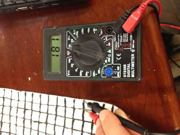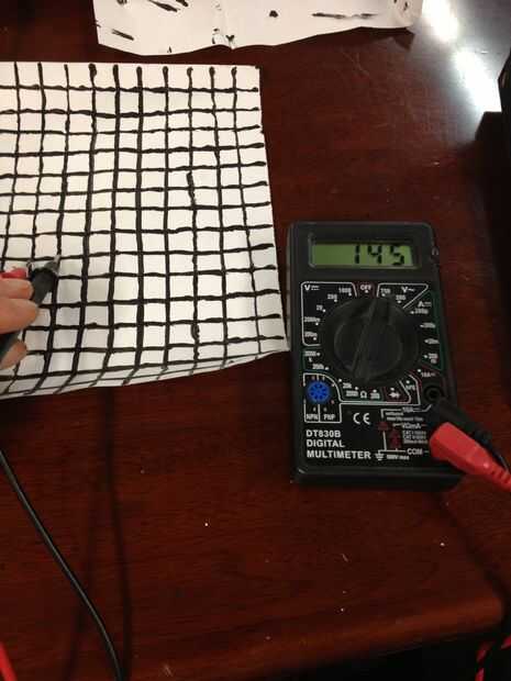 Hay tres medidas simples que hacer. Con el multímetro en modo de "ohmetro" (las unidades de resistencia son ohmios, y simbolizados por la letra griega mayúscula Omega), usted puede medir (1) la resistencia a través de un resistor "colgando" aislado que no forma parte de la red; Llamemos a esta resistencia R. A continuación, se puede medir (2) la resistencia a través de un lado de una plaza cerca del centro del papel; la resistencia debe ser teóricamente R_side = R / 2. Por último, se puede medir (3) la resistencia a través de la diagonal de un cuadrado; la resistencia debe ser teóricamente R_diag = R * (2 / pi). Por lo tanto, debe ser igual 2 pi * (R / R_diag). ¿Está cerca de 3.14? Tenga en cuenta que puedo lista a más de tres dígitos ya mi multímetro en la foto sólo tres. Tengo como cerca como 3,38 para un conjunto de mediciones.