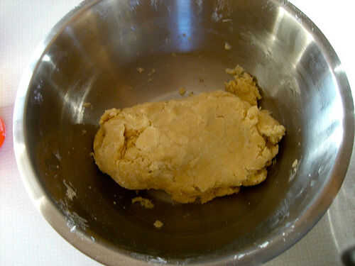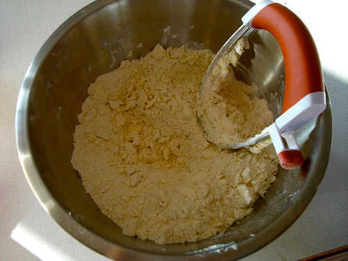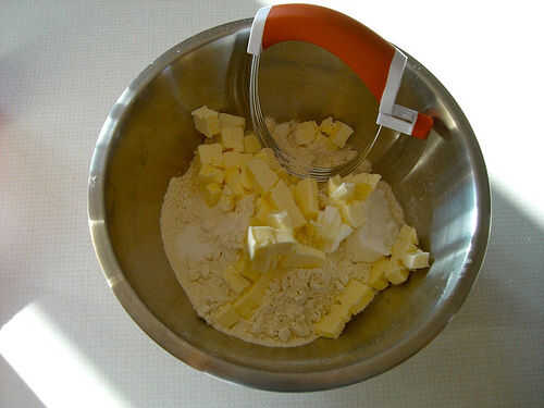 Mezclar los ingredientes secos incluyendo; sal, azúcar, canela (opcional) y harina. Cortar la mantequilla en trozos y cortar la mantequilla y la manteca en la masa hasta formar grumos de tamaño guisante vegetal. Añadir en el agua fría una cucharada a la vez hasta las formas de masa en una bola. Envolver la masa en papel plástico y dejar enfriar en la nevera al menos 30 minutos o como mucho dos días si es necesario.