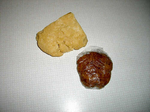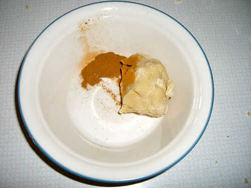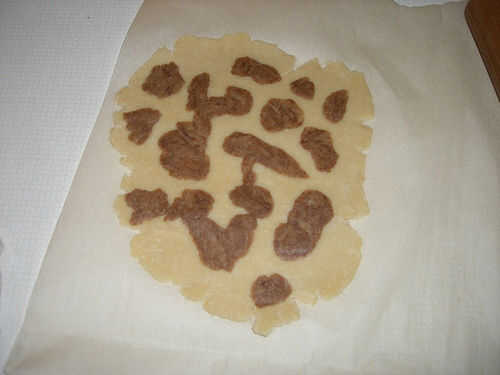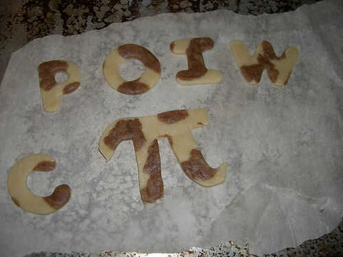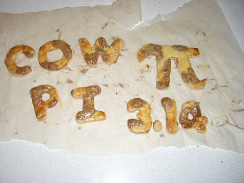 Con masa de pastel extra tome un pedazo pequeño (aproximadamente del tamaño de una pelota de golf) y doblar en aproximadamente 1 cucharadita de canela o suficiente para oscurecer la masa.  Si usted desea puede omitir la canela y agregar un colorante o su elección.  Utilice agua si es necesario incorporar la canela en la masa.  Rodar un poco la simple masa y esparcir gotas de masa sobre la masa blanca del punto y hacer una vaca como textura (como en la imagen).  Corte el símbolo para PI, así como las letras de "pi de la vaca".  Cepillo las Letras con el huevo extra y hornear en una hoja de pan de 15-20 minutos a 350 grados.  Agregar encima el pastel de calabaza.