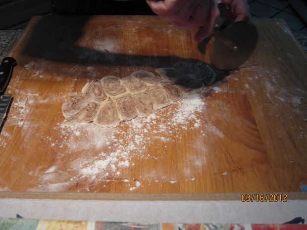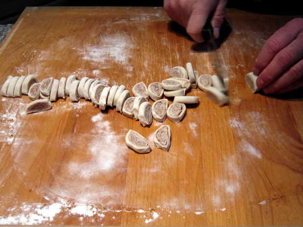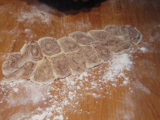 Una vez que tengas todo había enrollado rebanada el rollo en rodajas finas, 1/4 pulgada de espesor.