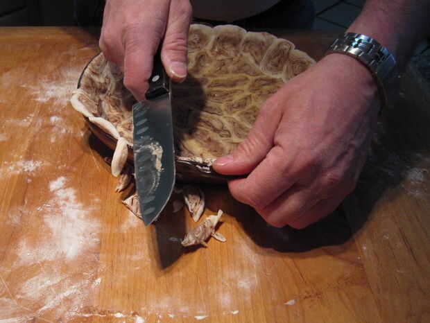 Ahora usando tus manos y a partir del centro, presione la masa y hacer ejercicio. Asegúrese de que se llenan todos los espacios entre las piezas. Puré les hacia abajo y hacia fuera hasta que has empujado la masa por los lados de la olla.