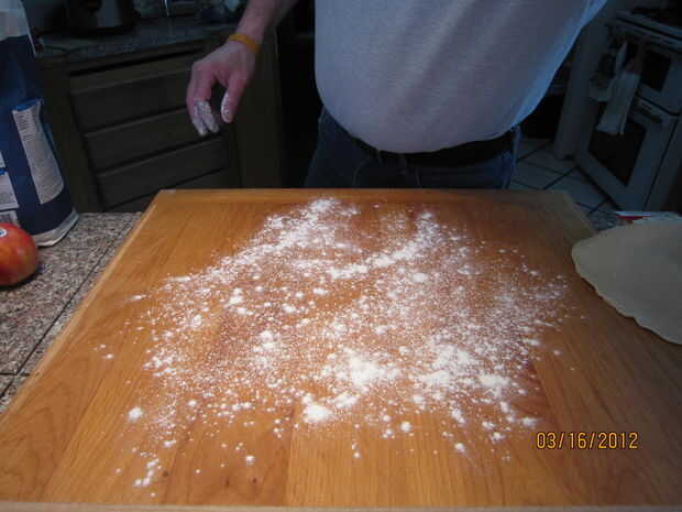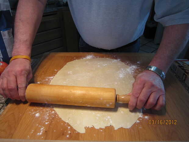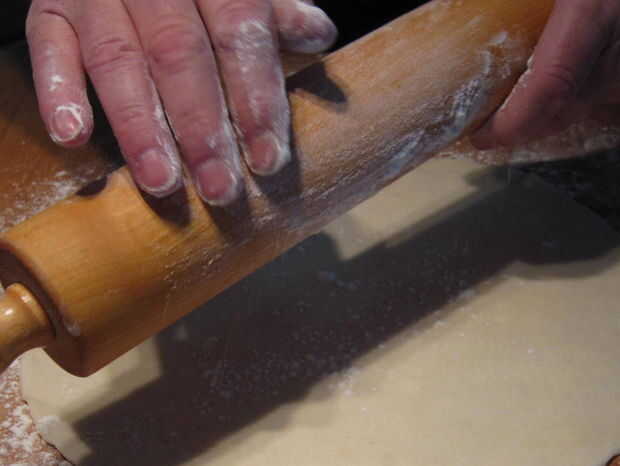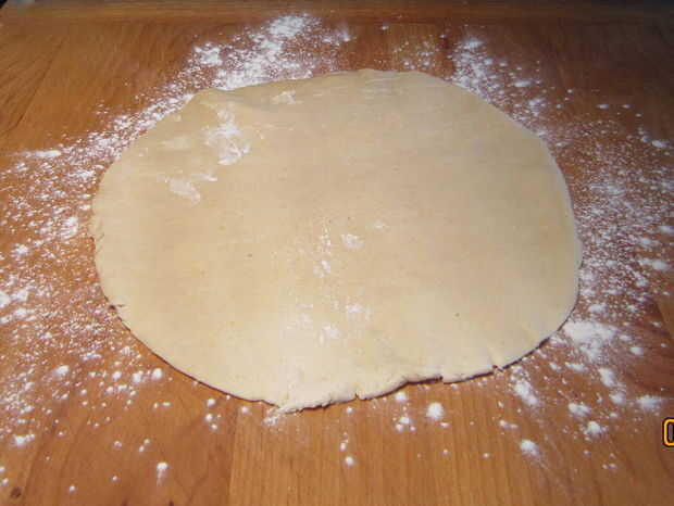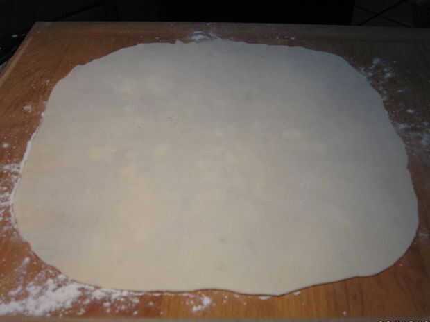 Desenrolle la tarta sobre la superficie enharinada, enharinar el rodillo y comenzar a rodar hacia fuera de la corteza hasta su muy fina. Prueba a estirar en forma rectangular.
