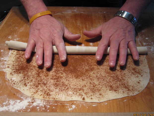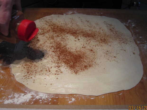 Una vez que tienes toda la masa con mantequilla, espolvoree canela uniformemente sobre el rectángulo entero.