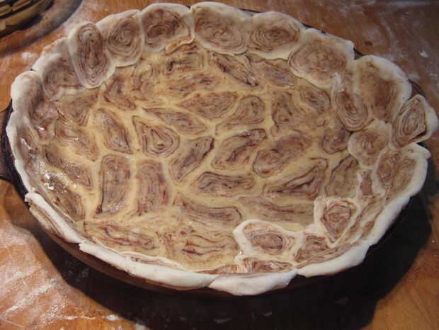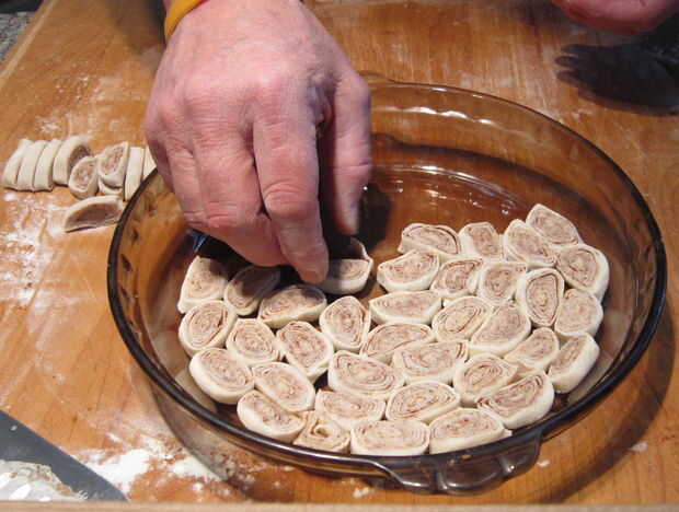Ahora empezar a tomar esos poco rollo de canela busca trozos y poner en la tartera enmantecada. Empiece en el centro y hacia fuera. Paquete firmemente en cuanto a Irán.