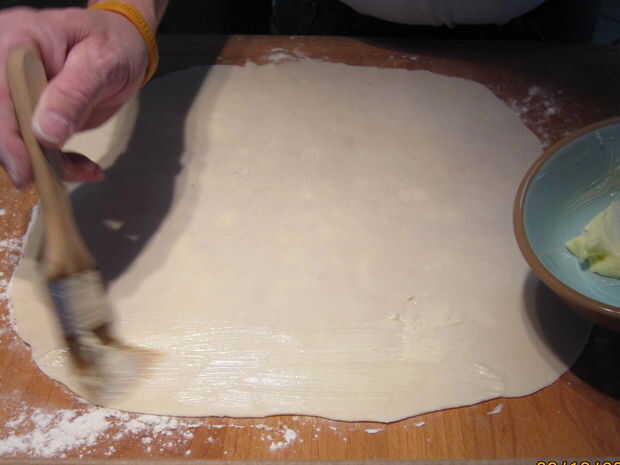 Usando una brocha de cocina o los dedos, unta mantequilla en la masa teniendo cuidado de no conseguir la mantequilla en el tablero. Ir hacia los bordes sin embargo.