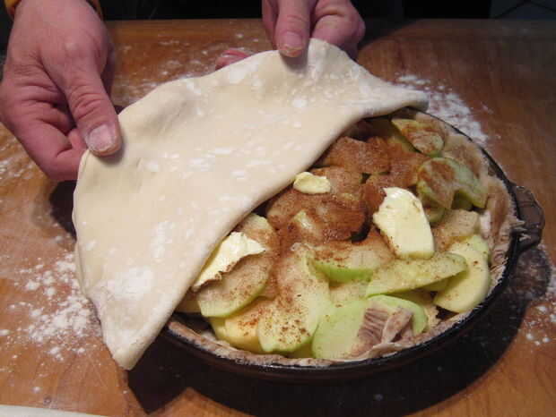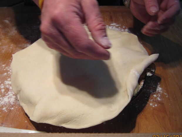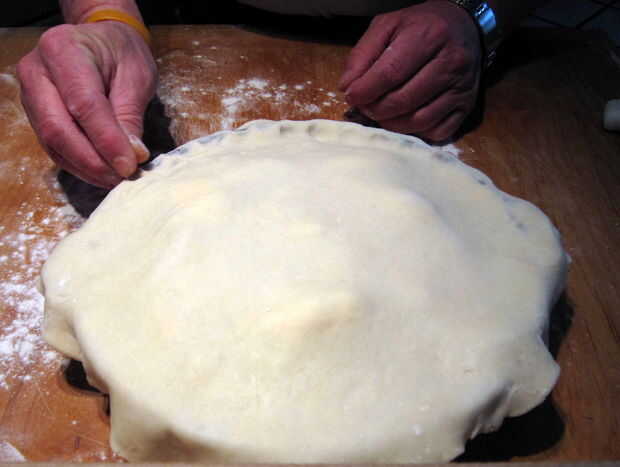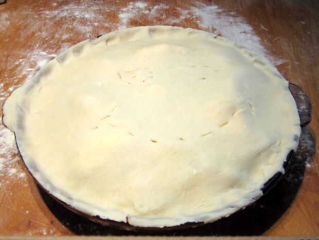 Desenrolle la otra corteza y coloque cuidadosamente sobre el pastel y empezar a pellizcar las dos cortezas juntos alrededor del borde. Pellizque y presione al mismo tiempo para sellar los bordes a la cacerola. Use un cuchillo para recortar la masa sobrante.