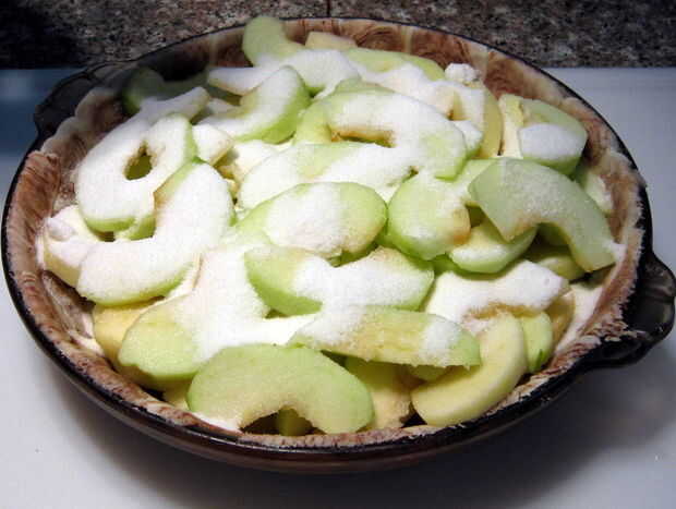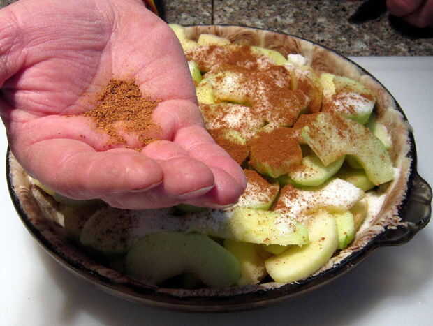 Una vez que tengas el pastel mounded hasta por encima del nivel de la olla. Espolvoree el azúcar uniformemente sobre las manzanas. Hacer lo mismo con la canela. Uso más o menos canela según sus gustos. Espolvorear una pizca de nuez moscada en la parte superior. Ver las fotos para las especificaciones exactas de un 'guión'.