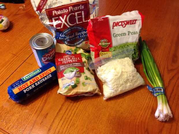 No tenía todos los ingredientes en la mano así que hice algunas sustituciones. He utilizado cebolla en lugar de una cebolla amarilla. También tuve un pimiento rojo por lo que sustituir con una bolsa de pimientos congelados picados.