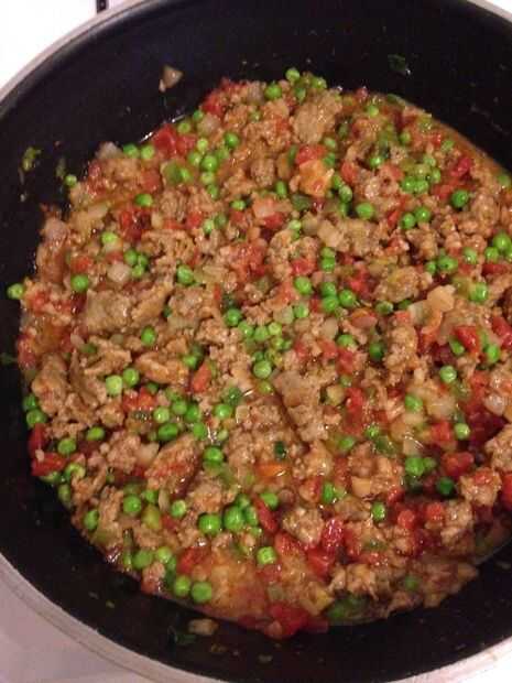 Salchicha marrón con ajo, pimienta y cebolla. Revuelva la mezcla para romper la carne aparte mientras se cocinan. Escurrir el exceso de grasa y agregue tomate, guisantes, mostaza y orégano. Llevar a ebullición y reduzca el calor. Cocinar a fuego lento durante unos 5 minutos mezclar sabores.