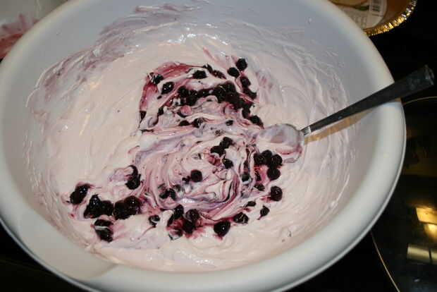 Agregue todo pero sobre 2 cucharaditas de los arándanos a la mezcla (el restante se utilizará para la decoración).  Doblarlas en la mezcla batida de yogurt con una cuchara hasta que se extienden uniformemente por todo.