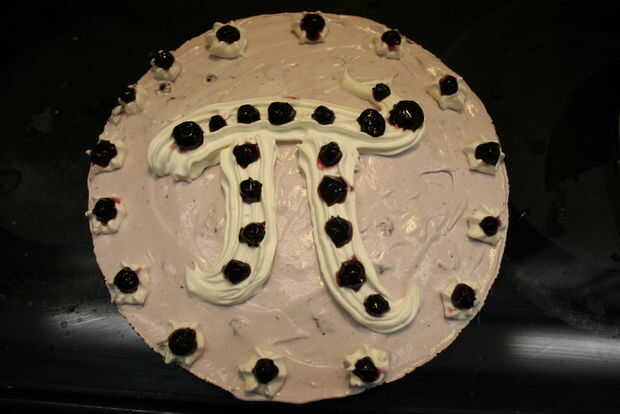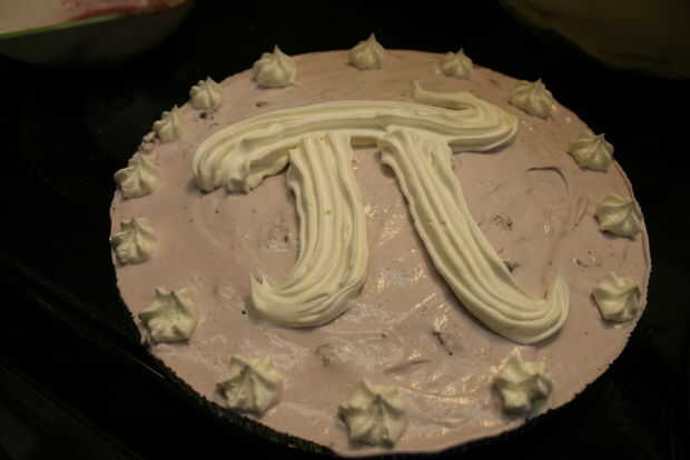 Utilizando un tubo o bolsa de decorar con una punta de estrella, dibuja un símbolo de pi en el centro de la tarta y hacer pequeñas estrellas alrededor de la circunferencia de la torta con la batida que fue retenido de la mezcla.  Colocar los arándanos a lo largo de las líneas del símbolo pi y en cada estrella individual para completar la decoración.