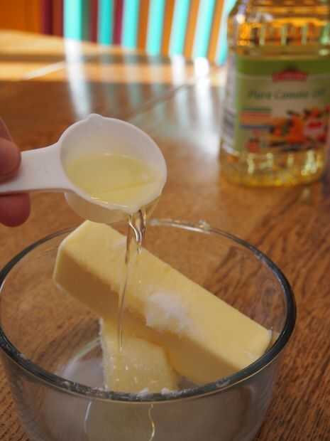 2. En un recipiente de pyrex, combinar la mantequilla, agua, aceite vegetal, azúcar y sal