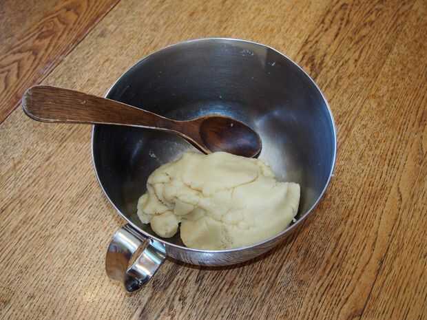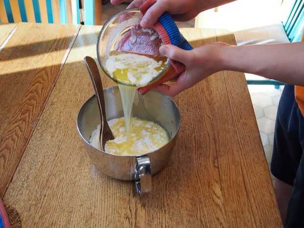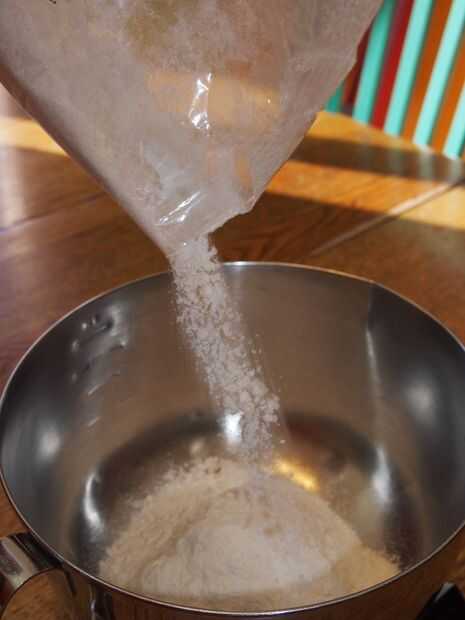 5. Retire el recipiente del horno y vierta en el vaso de harina
