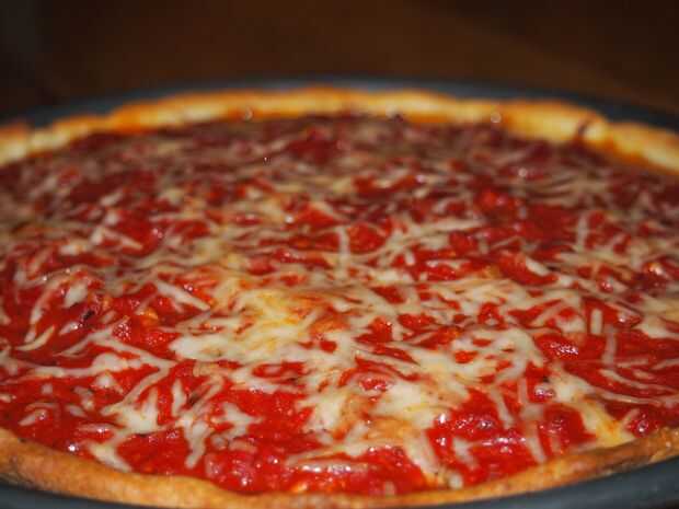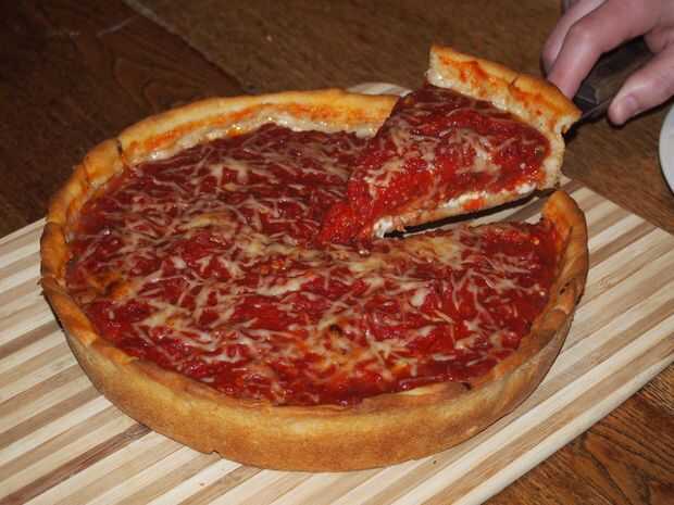 Deje que la pizza se enfríe durante 5-10 minutos para que la salsa no sale demasiado líquida. Después de este tiempo, o bien puede servir la tarta directamente en la bandeja o puede levantar la pizza de la sartén antes de servir. Si va a retirar la pizza de la sartén, es más fácil usar una espátula de plástico estrecha que puede ser doblado/cuña debajo del borde.
