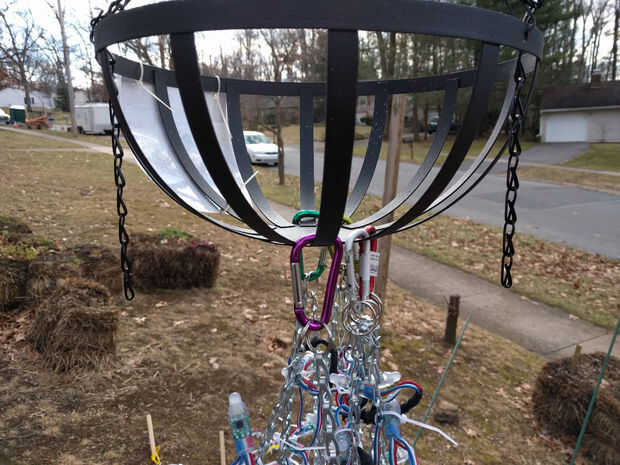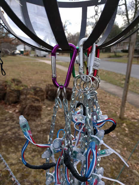 Las cuerdas tienen Llavero anillos en los extremos y luego pequeños mosquetones de enganche para el ancla de tierra y un soporte en la parte superior. Al principio, nos ató las copas todos juntos en un pequeño espacio, pero la parte superior tiene muy confusa y difícil de desenredar. Me pareció una cesta colgante barato una solución ideal para la parte superior, ya que da una distancia angular limpia y automática para cada cuerda. Un par de 50 cadenas de LED puede colocarse con sus extremos de unos 500mm aparte, y los conectores de alimentación permiten unos 500mm entre cada par. Sobre todo, los fondos de los LEDS están en aproximadamente un radio de 1200mm/4 pies.