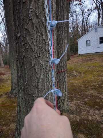Nos ligan un anillo en una rama conveniente de un árbol y, a continuación, una cuerda para el montaje de la cadena a través de eso. Proporciona una manera conveniente para levantar y para bajar las cadenas de mantenimiento o montaje.