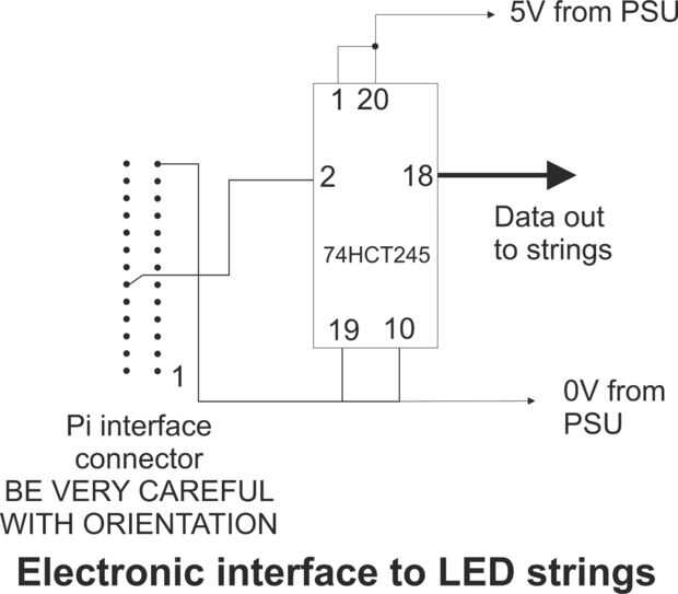 Electrónicamente, el diseño es muy simple. Todo lo que necesitas es un pasador, el hardware PWM pin en el Pi para los LEDs, pero necesita para "amortiguar" la señal, conversión de 0..3.3V a 0..5V. Hay muchas maneras de hacerlo, pero por lejos el más sencillo es encontrar un dispositivo como el chip de 74HCT245. Lo importante aquí son las tres carta HCT. HCT lógica tiene un rango de entrada que acepta 3v3 lógica y lo convierte en el 5logic en la salida de la viruta.