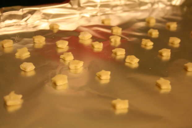 Estire trozos de masa de tarta en una sola pieza. Con el cortador de galletas estrella, corte al menos treinta estrellas (sólo en caso) de los desechos. Colóquelas en una hoja revestida con papel y lugar en el horno.