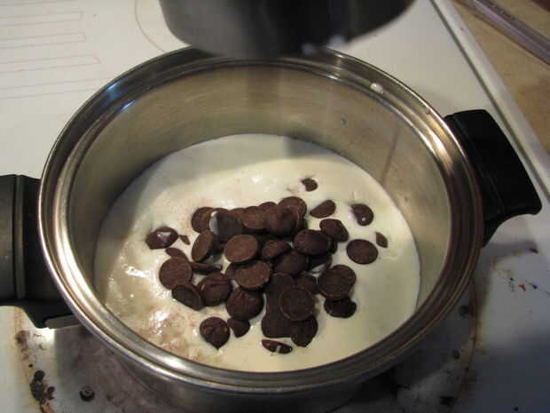 Colocar crema en una cacerola pequeña y calentar a quemaduras. Retirar del fuego y añadir trocitos de chocolate. Dejar reposar un par de minutos para ablandar. Agitar vigorosamente hasta que esté completamente mezclado. Chocolate frío por poner en el refrigerador.