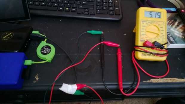 Corte los cables a una buena longitud, pero no demasiado corto, por si acaso te equivocas hasta el empalme. Yo no cuenta de cuanta longitud necesitaba para el LCD... Necesitará conectar los cables rojo y negro desde la USB al correspondiente rojo y negro en el cable del LCD. Usé pinzas cocodrilo para probar las conexiones con mi voltímetro. Me estaba poniendo 5.15v que era el voltaje adecuado para alimentar la pantalla LCD.