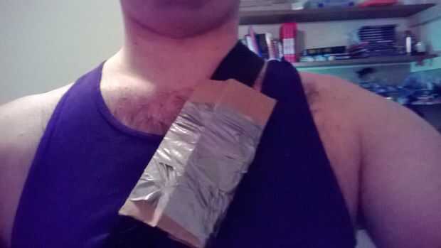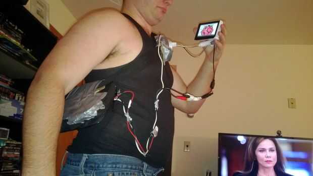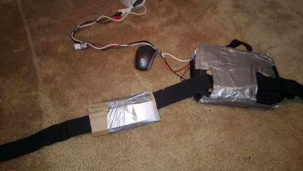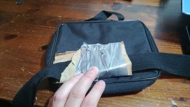 Se trata de la versión 2.0 de mi proyecto caso porque pensé que un caso sea realmente bueno. Tenía un viejo cinturón de herramienta que nunca usé, así que envueltos con dos pedazos de cartón y conducto les había grabado juntos. Esto le permite deslizar su caso y pantalla LCD de montaje en él para llevar más fácil. Os pongo el montaje cerca de mi pecho para una más fácil visualización.