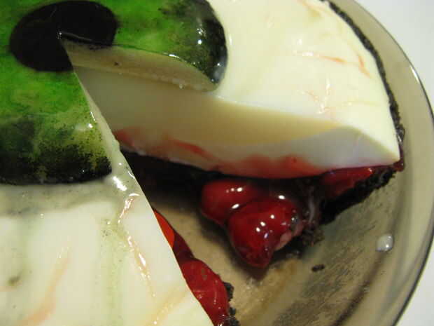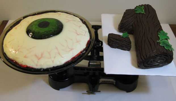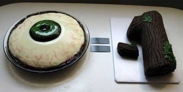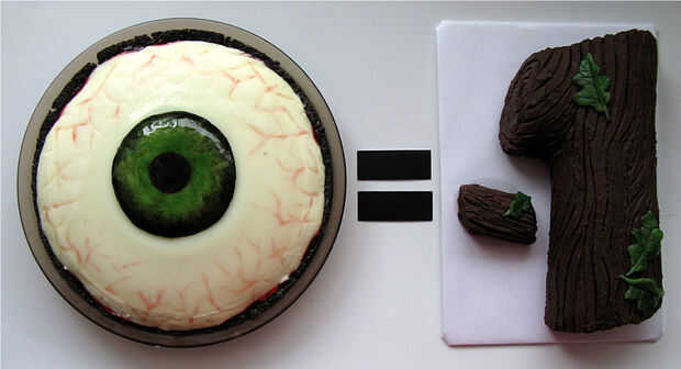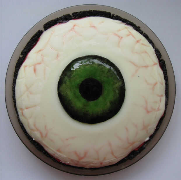 Mi primera idea para una representación de comestible era utilizar panna cotta para el globo ocular, ya que zangolotean-ness sería perfecto (y algo escalofriante). Relleno de cereza de la tarta parecía una buena opción para mantener la Panacota vertical en una base de tarta de galleta de chocolate. Cereza asocia muy bien con chocolate y almendra, para que éste se convirtió en el esquema general de sabor, incluyendo el uso de mazapán para el iris. Como un bono, "goo" de tuberías desde el relleno del pastel cereza trabajaban maravillosamente para hacer que las venas del globo ocular.
