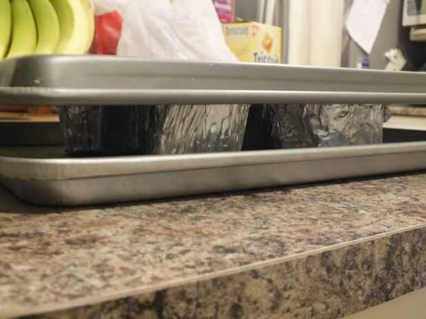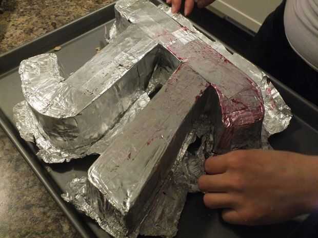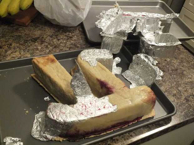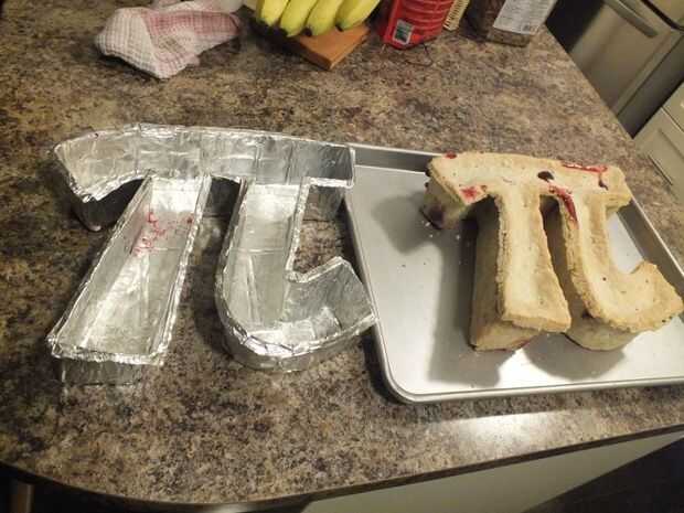 Una vez que el pastel había enfriado a temperatura ambiente, lo ponemos entre dos bandejas para darle la vuelta cara abajo para el retiro del molde. Una vez que la hoja estaba apagado, se utilizó la misma intercalando técnica para poner nuestro π respaldar cara.