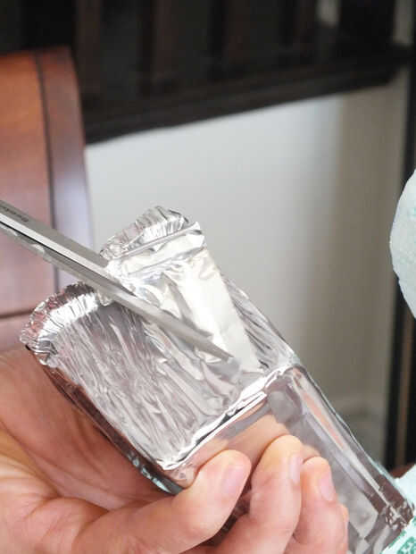 Reformado los rincones para mi plantilla manteniendo la longitud de cacerolas del pan. Entonces comprometidos y recortar dos lados de un molde y había atado con la cinta.