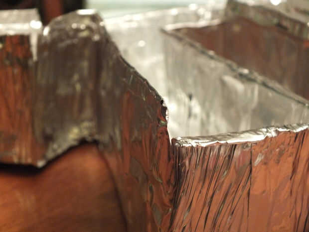 Hice un corte vertical en las esquinas y enrolla hacia atrás dos pliegues de aproximadamente 5 mm. cinta los bordes superpuestos de borde y ya tienes un molde resistente.