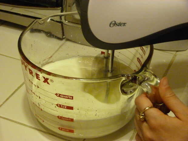 Usando una batidora eléctrica, cartón entero batidor de leche crema agregar azúcar, extracción de extracto de vainilla y 1/2 cucharadita de ron.