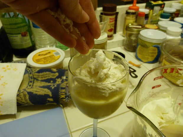Copa Retire del refrigerador. Superior con el restante batida crema y coco.