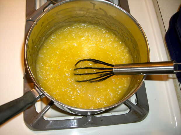 2) Cocine sobre fuego medio, revolviendo constantemente hasta espesar. (Se sentirá resistencia cuando revolviendo y sabrá cuando es.  Toma generalmente 10-15 min)