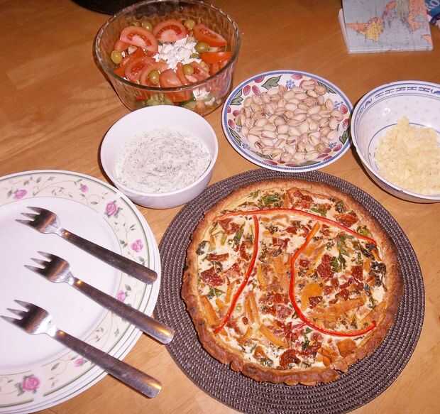 7. Tome sus largo rebanadas de pimiento rojo y chulo tu pastel con un π en la parte superior.