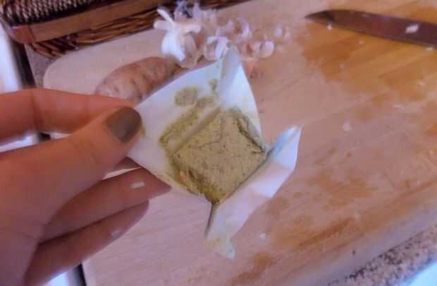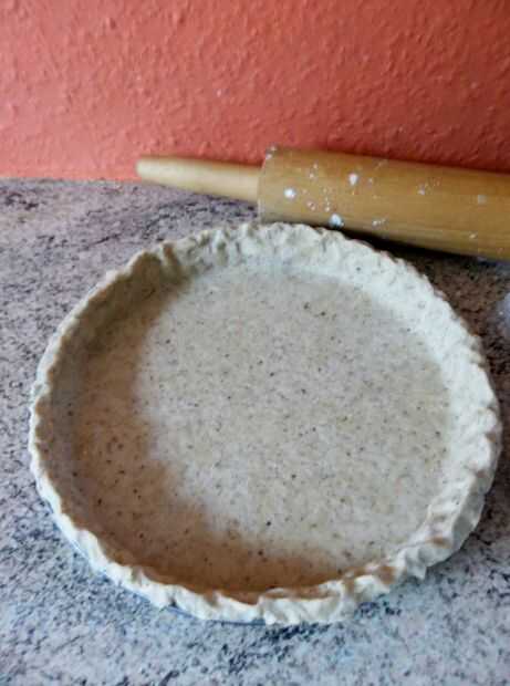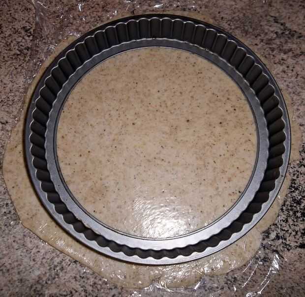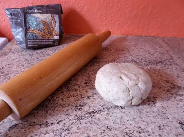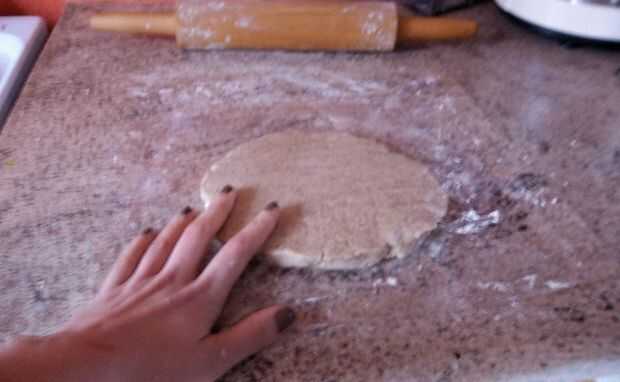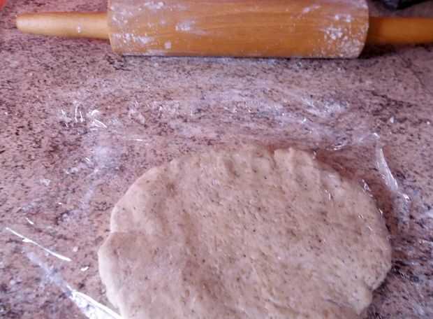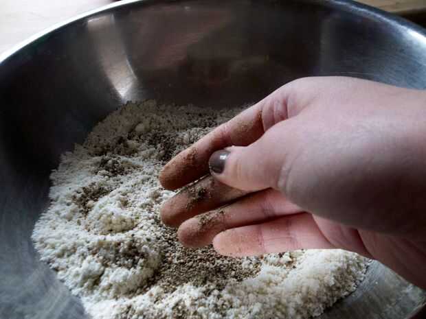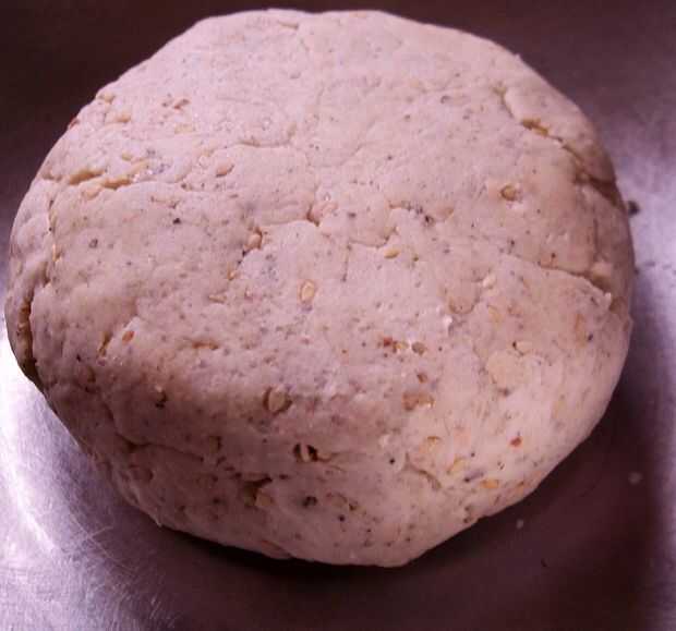 1. vaciar la mezcla de corteza de pastel en un tazón (precalentar el horno a la temperatura adecuada también). Utilicé una mezcla y agrega la pimienta, nuez moscada, sal, ajo en polvo, semillas de sésamo y agua que mi mezcla de corteza.  Rodar en una bola.