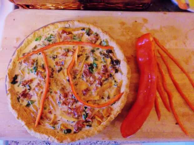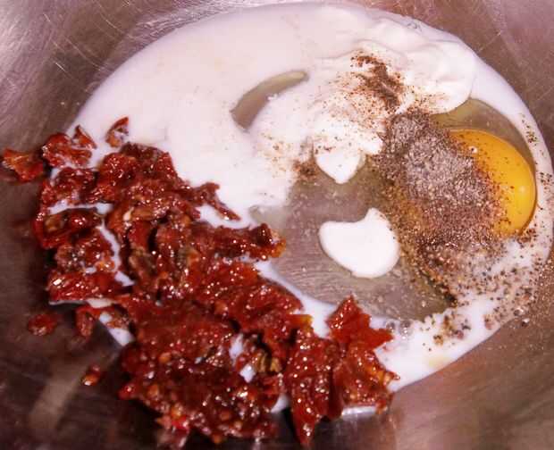4. en un tazón, batir huevos, yogur griego, pimiento y tomate picado secada al sol.