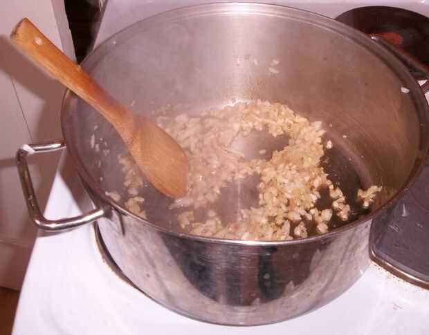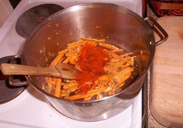2. cortar la cebolla, ajo y verduras. Calentar aceite y mantequilla en lo alto y mezcla de verduras, azúcar, caldo de pimentón, sal, comino y hortalizas.