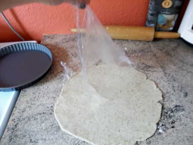 2. la bola de masa de pastel entre dos grandes hojas de envoltura de plástico, que debe ser un poco más grande que su tartera de pop. Esto facilita la parte rodante como el pastel.
