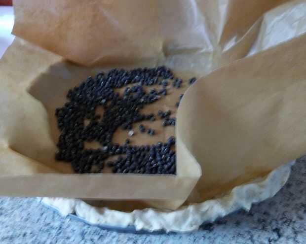6. toma una hoja de papel de cera o de pergamino y se derrame unos frijoles que apenas pesan la empanada para que no soplo para arriba mientras que está en el horno.