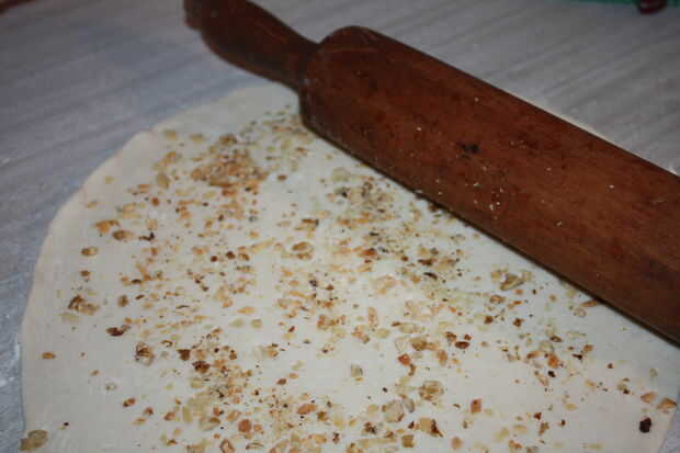 Sobre una superficie ligeramente enharinada, extienda la masa de empanada. Espolvorear con piñones picados finamente y gire suavemente las tuercas en la corteza con un perno de balanceo.