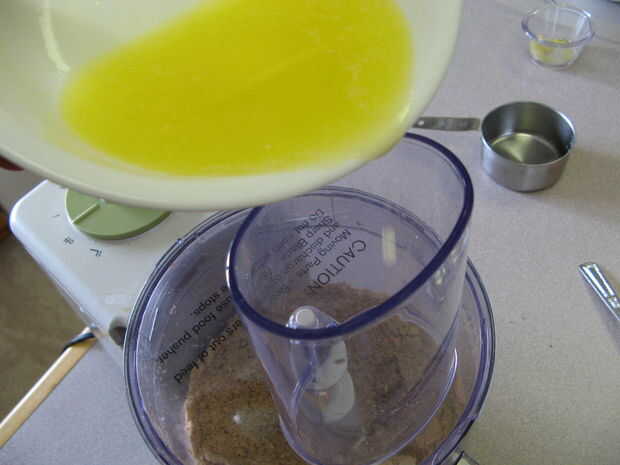 5. lenta llovizna en la mantequilla derretida y continuar procesar hasta que la mantequilla se mezcla bien